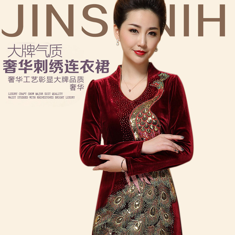 2015秋季新款加肥加大鳳凰金絲絨長袖大碼媽媽裝中老年旗袍連衣裙 /