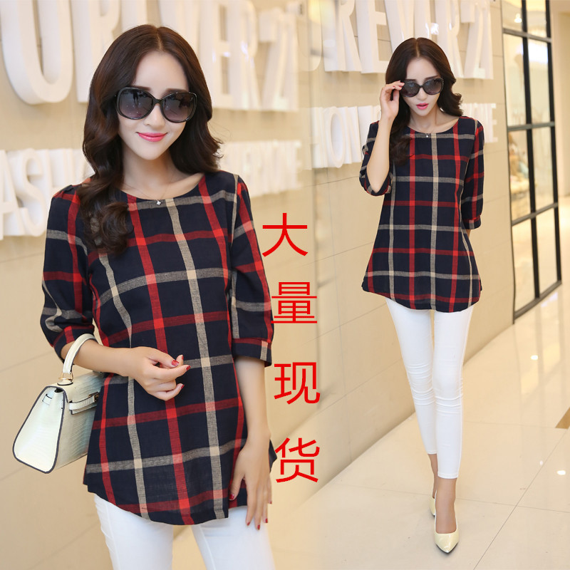 2015秋裝潮胖妹妹顯瘦7分袖上衣大碼女裝棉麻T恤格子 /