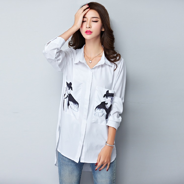 2015歐洲站美女雙口袋印花寬松時尚潮休閑長袖百搭白襯衫 /