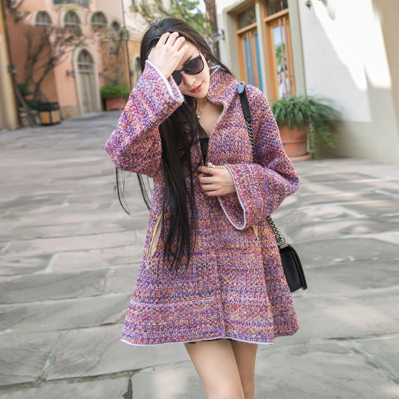 2015秋季新款韓版名媛氣質(zhì)混色針織拉鏈長袖中長款毛衣外套 /