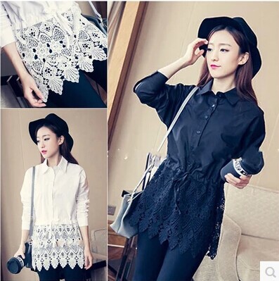 韓版翻領(lǐng)中長款襯衣打底衫蕾絲拼接蝙蝠袖襯衫 /