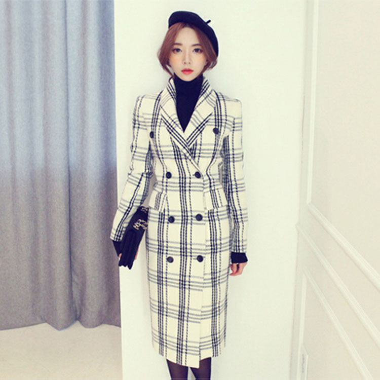 2015年秋冬韓版千鳥格收腰及膝雙排扣毛呢風衣大衣外套女送毛領潮 /