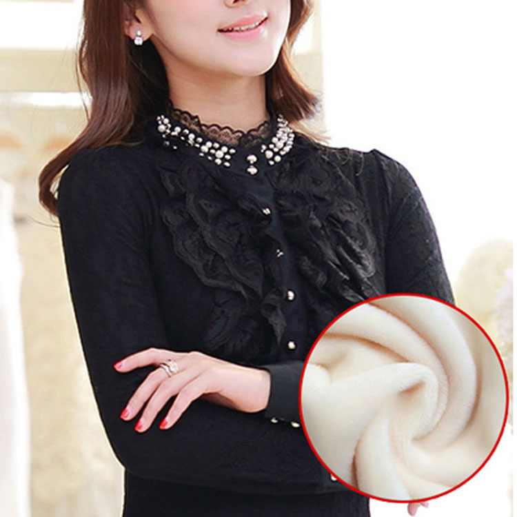 2015秋冬韓版修身顯瘦釘珠時尚花邊領加絨加厚蕾絲衫打底衫歐洲站 /