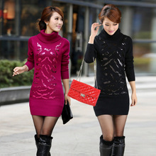 2015女款韓版中長款亮片修身顯瘦高領(lǐng)堆堆領(lǐng)加厚針織衫打底毛衣 /