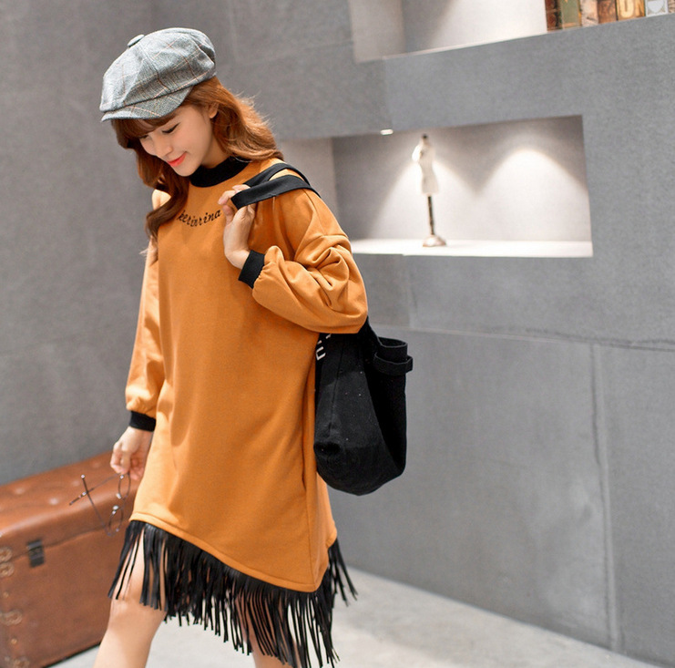 Kerin Rina2016秋冬韓國長袖寬松字母刺繡流蘇下擺加絨衛(wèi)衣裙女 /