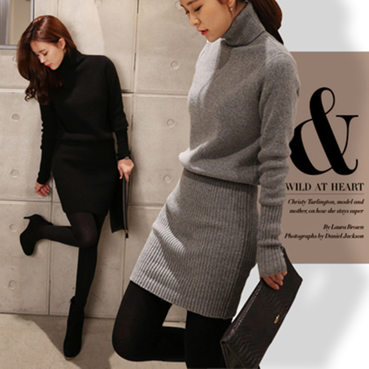正品代購韓國sz2015秋冬中長款毛衣修身針織高領(lǐng)包臀打底連衣裙女 /