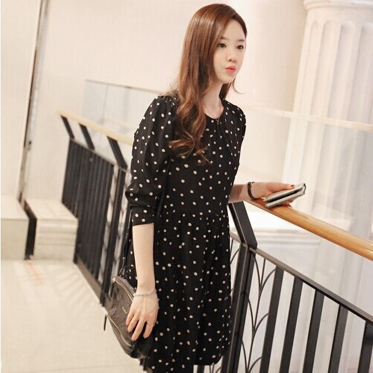 2015秋冬新款韓版修身雪紡打底裙波點(diǎn)百褶長袖大碼顯瘦連衣裙女 /