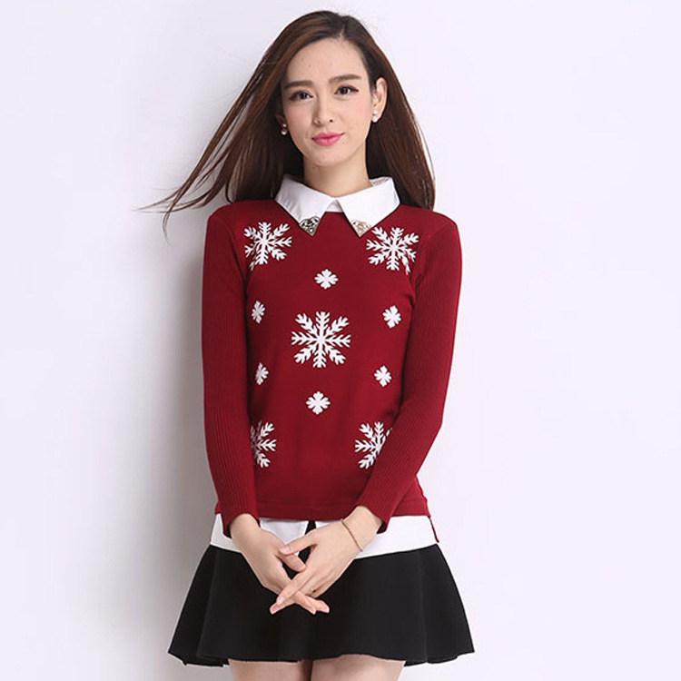 2015春款女裝襯衫領(lǐng)套頭毛衣女 雪花圖拼接假兩件針織衫女打底衫 /