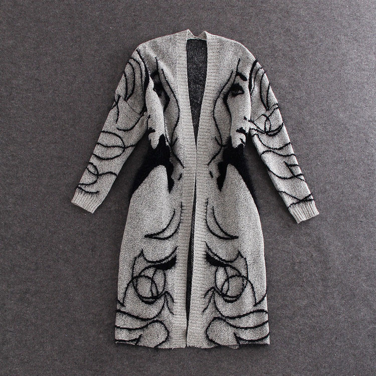實拍2015春季女裝歐美風(fēng)美人頭提花長款開衫外套女 針織開衫毛衣 /