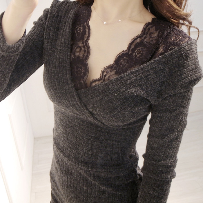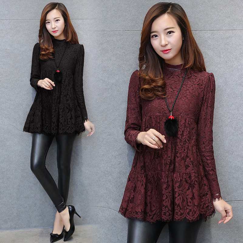 加絨加厚中長款蕾絲打底衫女2015秋冬新款拼皮裙擺蕾絲小衫潮上衣 /