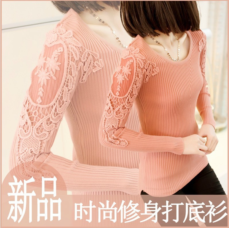 2015春季新品針織衫 韓版修身圓領打底衫 蕾絲中長款針織衫毛衣女 /