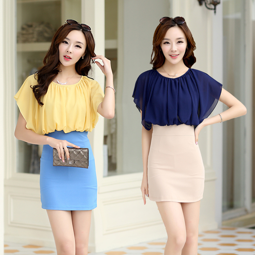 2015新款拼色連衣裙 蝙蝠袖大碼裙子女裝一步裙裹臀裙女 /
