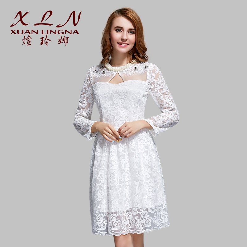 廠家直銷2015時(shí)尚連衣裙白色蕾絲花邊裙秋冬款加絨釘珠 /