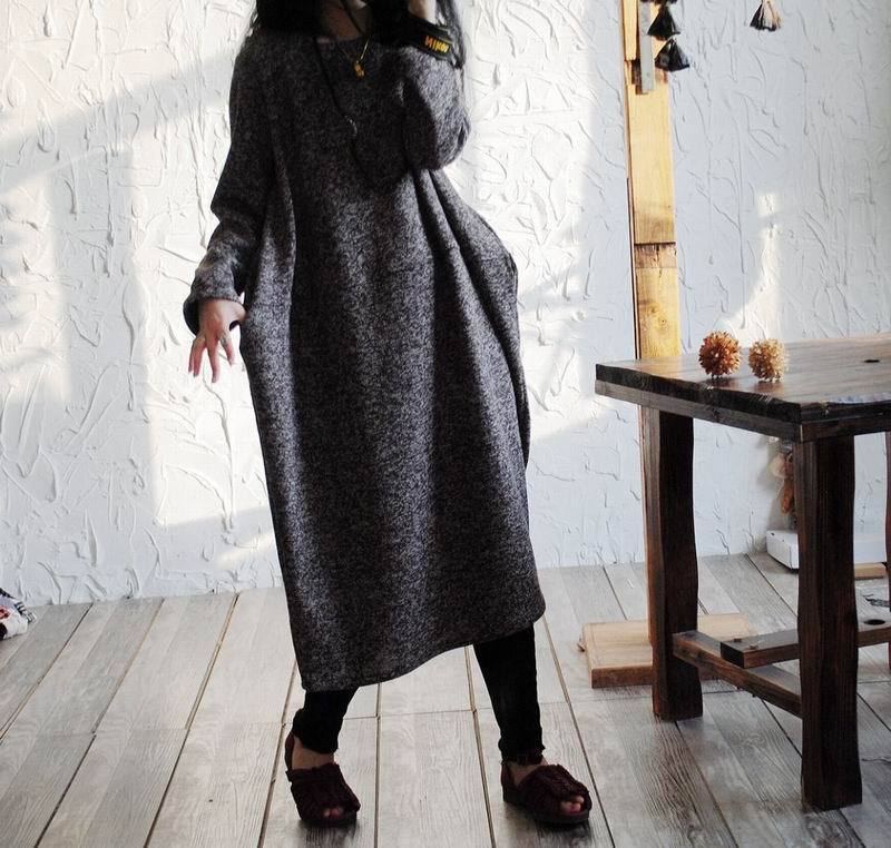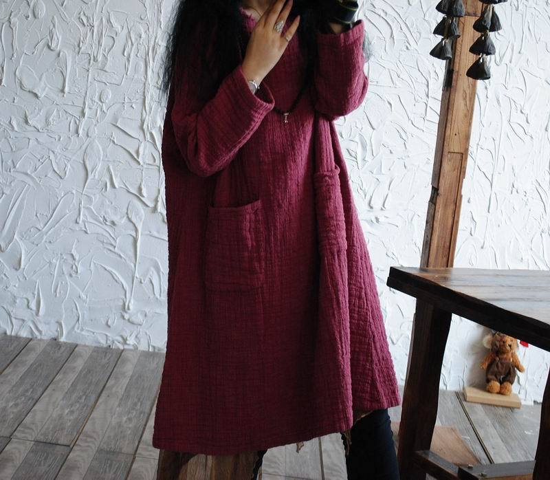 秋冬原創(chuàng)設(shè)計(jì)女裝簡(jiǎn)約文藝范加厚棉麻肌理保暖打底禪意袍子連衣裙 /