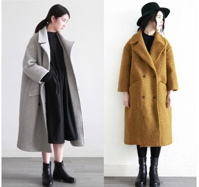 紅人館歐美風(fēng)翻領(lǐng)長袖雙口袋中長款毛呢外套女裝秋冬新款 /