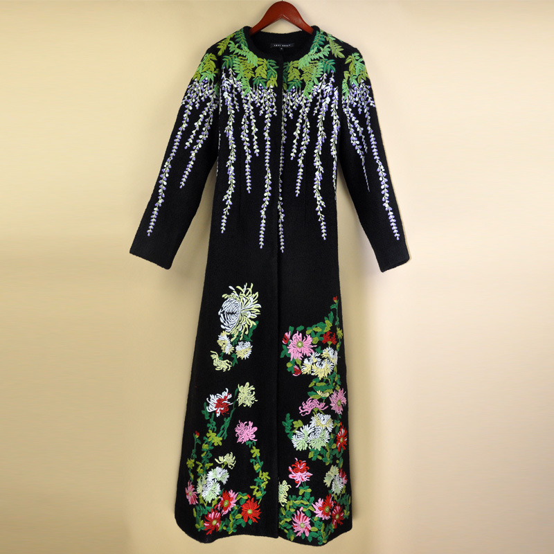 歐洲站2015秋冬裝歐美大牌民族風(fēng)刺繡花大碼超長款修身大衣外套女 /