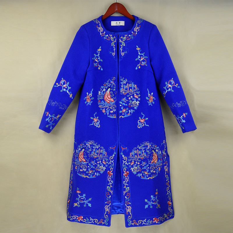 2015秋冬裝中國民族風(fēng)重工刺繡花朵大碼羊毛呢子中長款大衣外套女 /