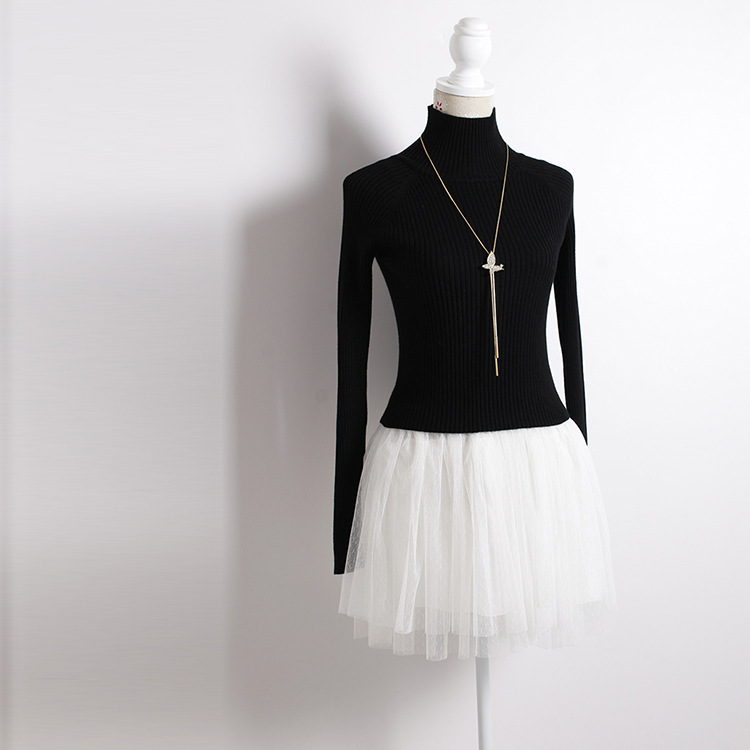 15秋冬新款半高領短款針織衫 女式套頭黑色顯瘦螺紋針織打底衫646 /