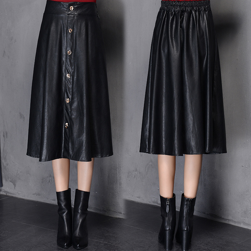 2016新款A(yù)型PU皮半身裙長(zhǎng)裙女寬松大碼黑色單排扣高腰皮裙時(shí)尚 /