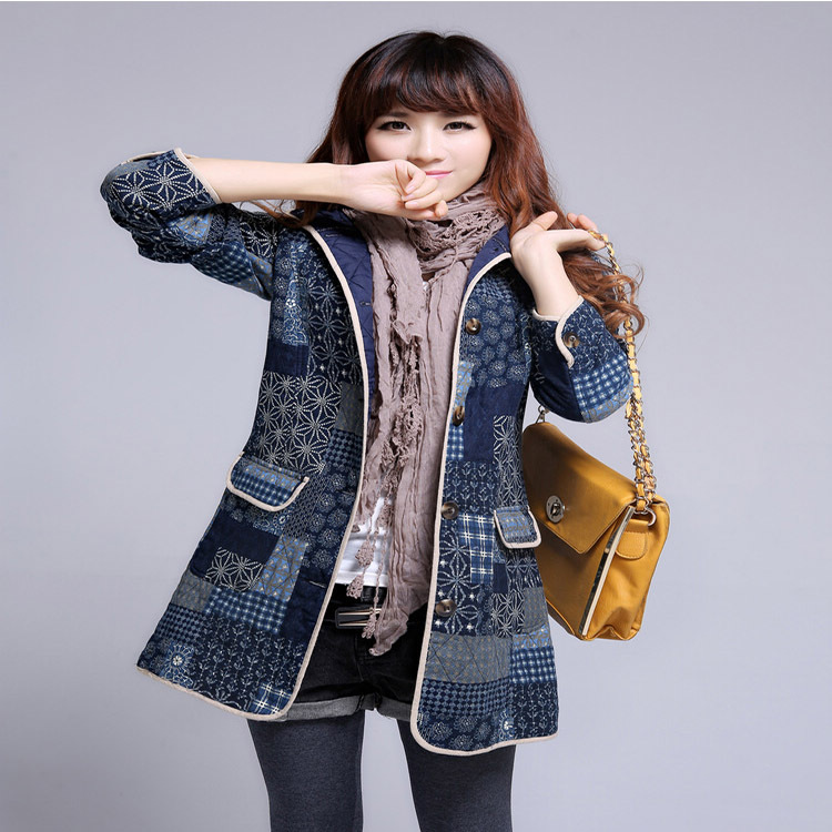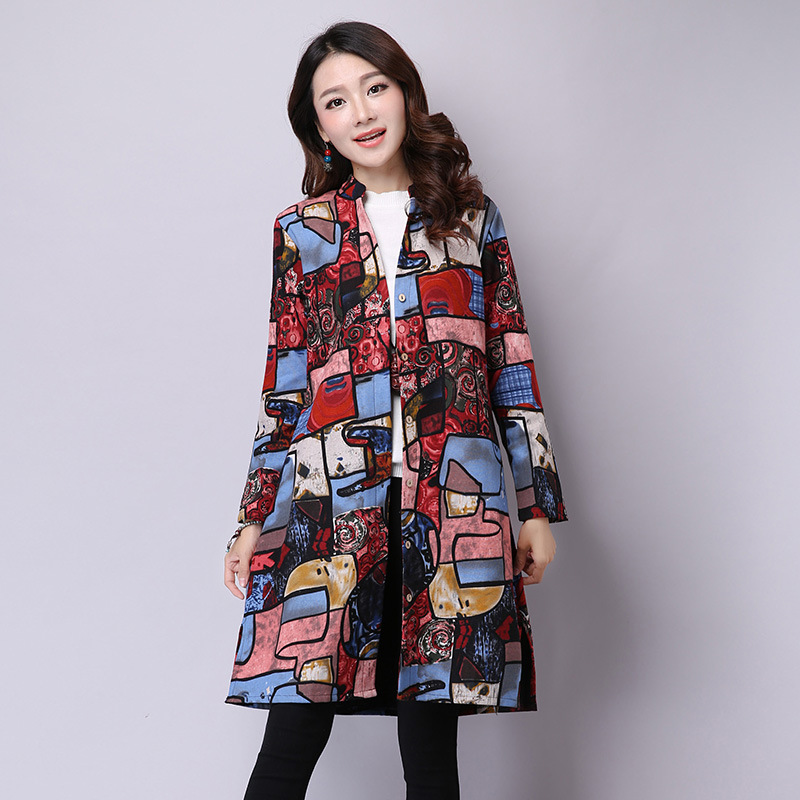 大碼女裝修身連帽外套棉麻印花上衣夾棉保暖長袖風(fēng)衣1505 /