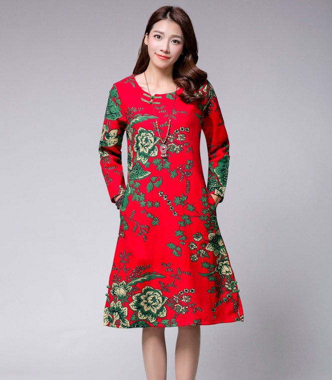 大碼女裝寬松復(fù)古胖MM加絨加厚棉麻印花長袖連衣裙1572 /