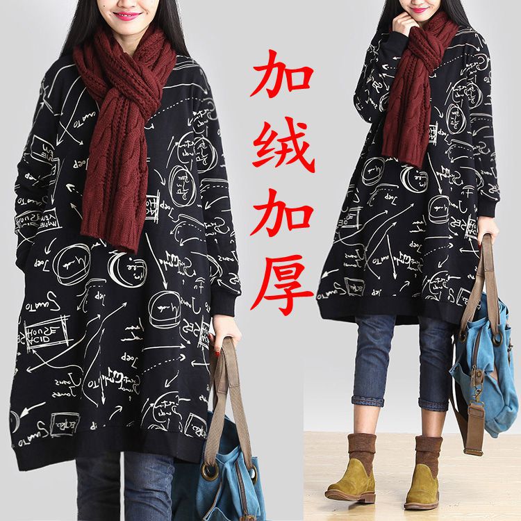 實拍秋冬新款韓版大碼女裝加絨加厚印花棉麻長袖連衣裙1575 /