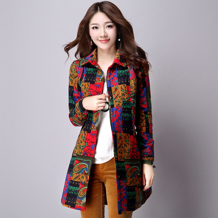 新款秋韓版大碼女裝顯瘦中長款棉麻印花夾棉休閑襯衫文藝風(fēng)1520 /