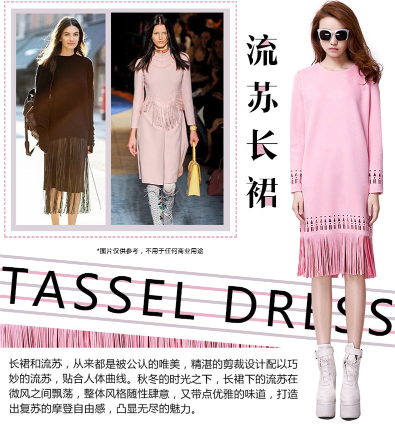 歐美秋冬季修身流蘇打底女中長款顯瘦A字長袖麂皮絨連衣裙 /