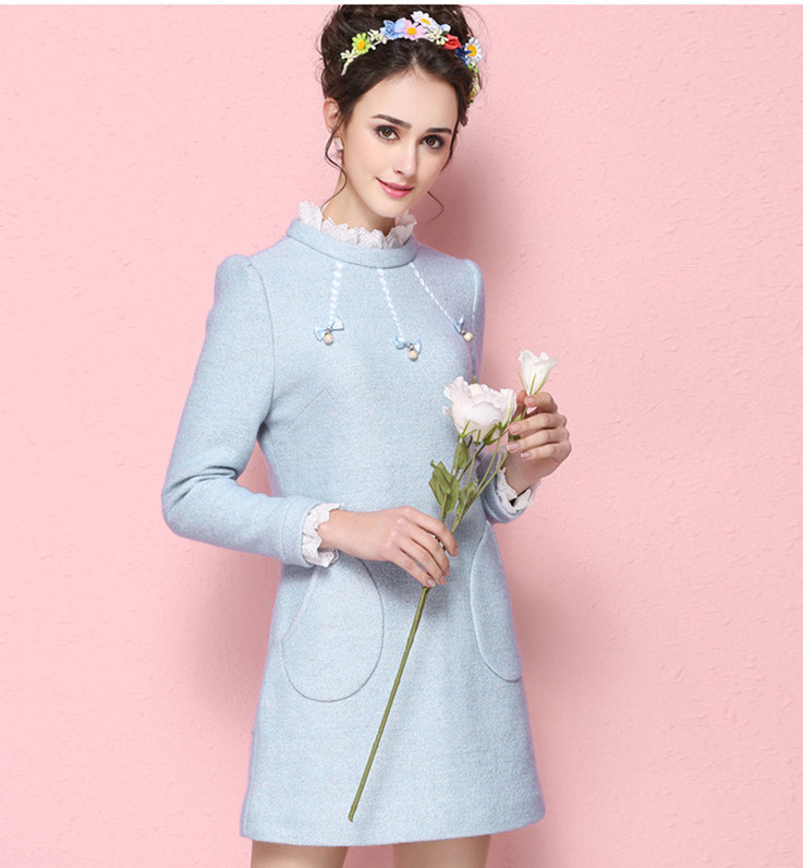 2015秋冬款新品連衣裙女中長款毛呢加厚修身長袖立領(lǐng)小香風打底裙 /