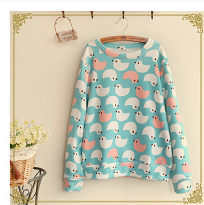 日系森林系 2015秋季 新款女裝 可愛小鳥印花舒適加絨長袖衛(wèi)衣女 /