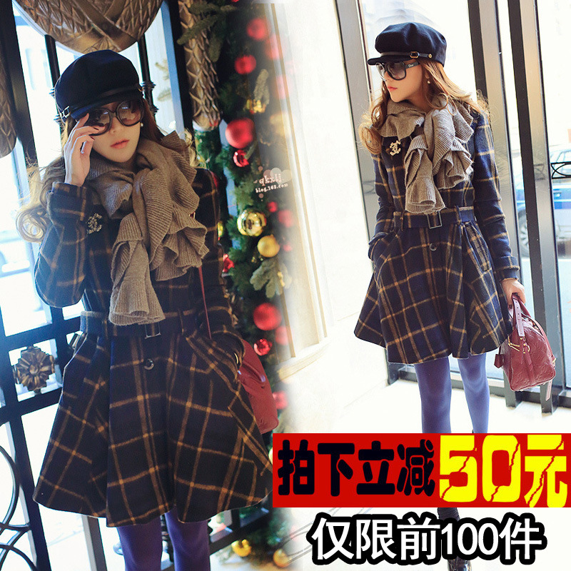 韓版修身毛呢外套中長款秋冬新款女裝韓國大碼格子羊毛呢子大衣潮 /