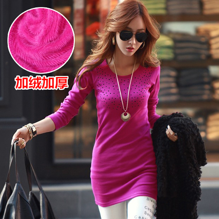 2015秋冬新款寬松大碼加絨加厚韓版修身長袖女t恤中長款打底衫女 /