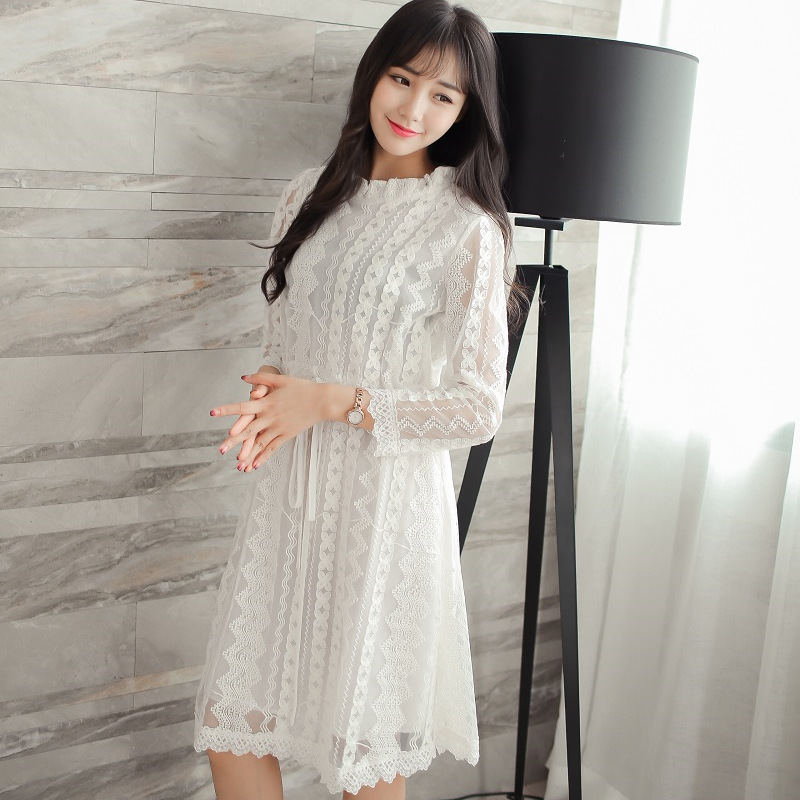 2015秋冬新款韓版長袖蕾絲打底連衣裙顯瘦白色刺繡收腰裙長裙 /