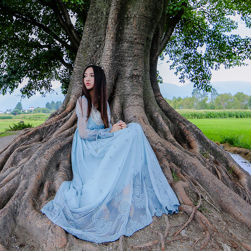 實拍原創(chuàng)設(shè)計復(fù)古文藝范蕾絲刺繡長袖連衣裙度假玉簪花禮服長裙 /