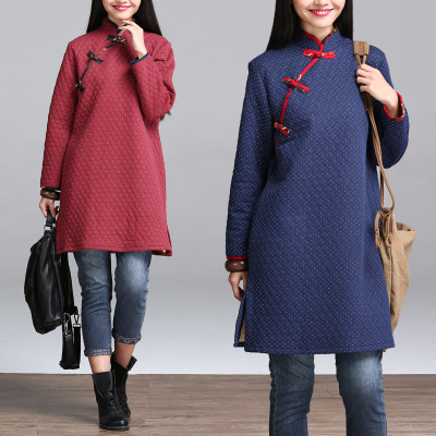 原創(chuàng)中國風(fēng) 手工高領(lǐng)盤扣 開叉復(fù)古 夾棉加厚 袍子女 /