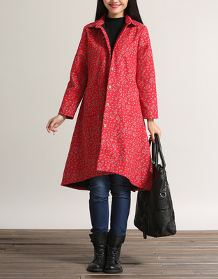 2015秋冬民族風(fēng)女裝棉麻中長款大碼印花外套加絨加厚風(fēng)衣 /
