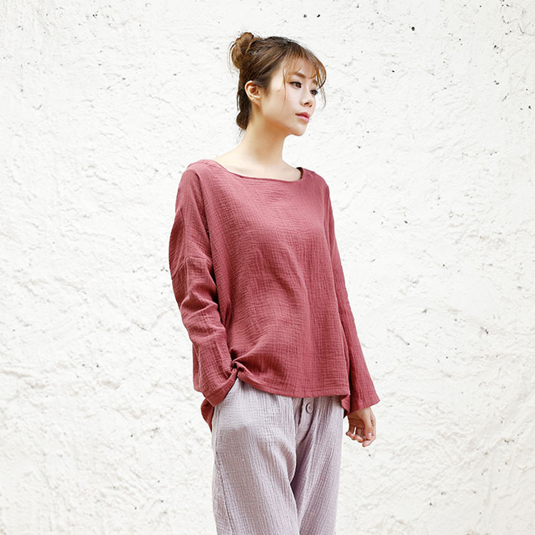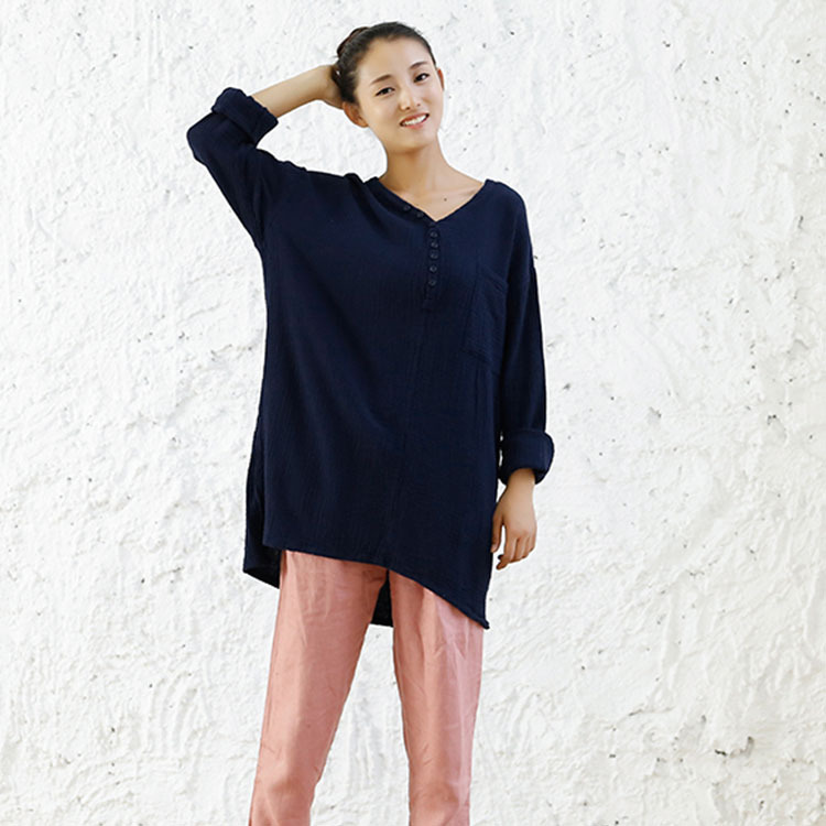 秋冬原創(chuàng)設(shè)計復(fù)古布衣百搭簡約大方寬松文藝中長款套頭襯衫打底衫 /