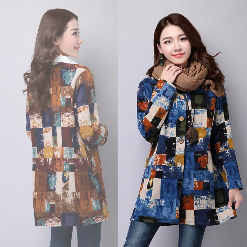 實(shí)拍 民族風(fēng)女秋冬中長款水墨印花棉衣開衫棉服寬松大碼 /