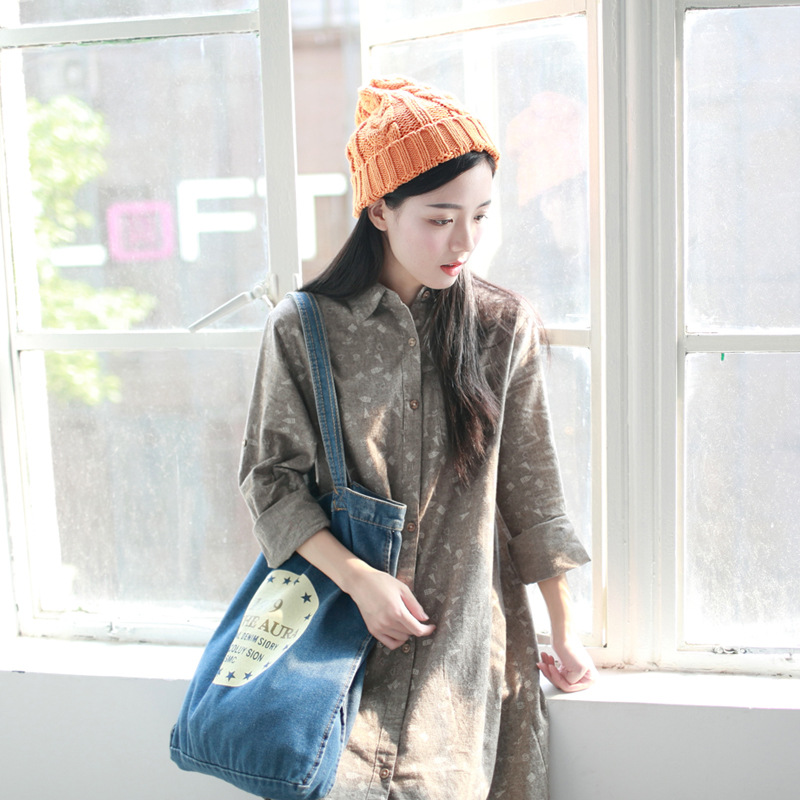 日系森女風復古城堡印花簡約翻領(lǐng)棉布中長款襯衫女 早春新品A1520 /