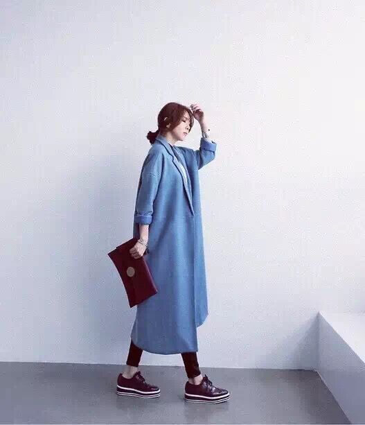2015冬裝新款 韓版寬松直筒中袖呢子大衣外套 湖藍色超贊 /