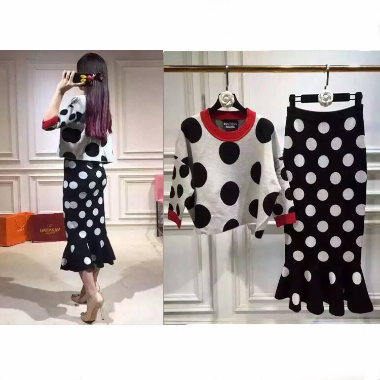 歐洲站 2015秋冬女裝新款 歐美時尚大牌波點(diǎn)羊毛衫 魚尾包臀套裝 /