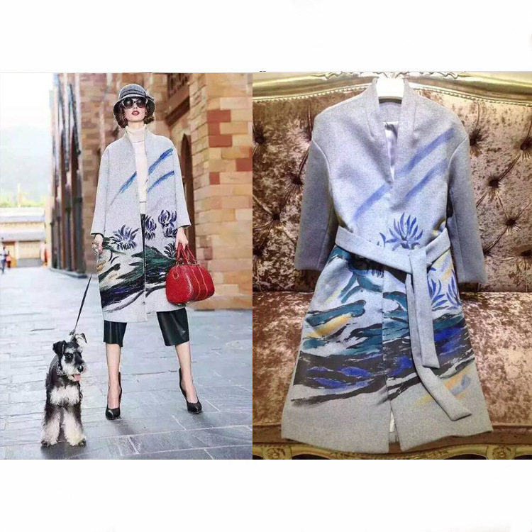 2015冬季新款女裝 歐美時尚純手工繪畫印花羊毛大衣 毛呢外套女 /