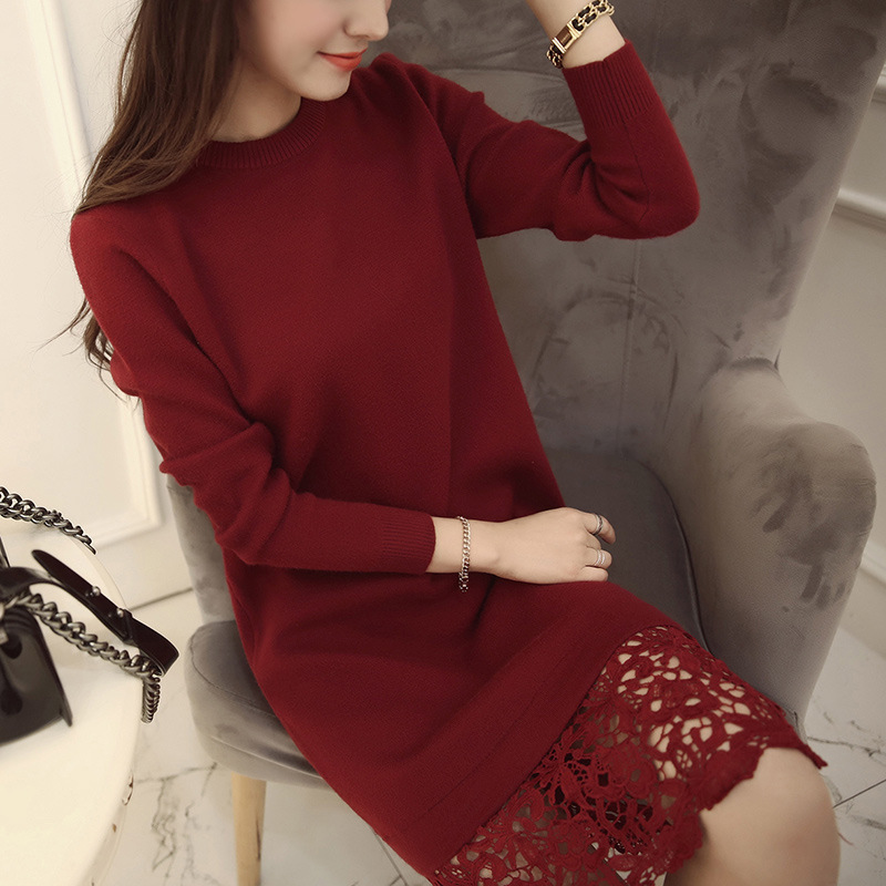2015秋冬新款韓版時尚下擺蕾絲長款圓領修身厚毛衣女連衣裙女 /