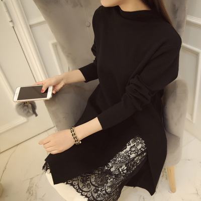 2015秋冬爆款蕾絲拼接開叉中長款打底針織衫女毛衣顯瘦連衣裙 /