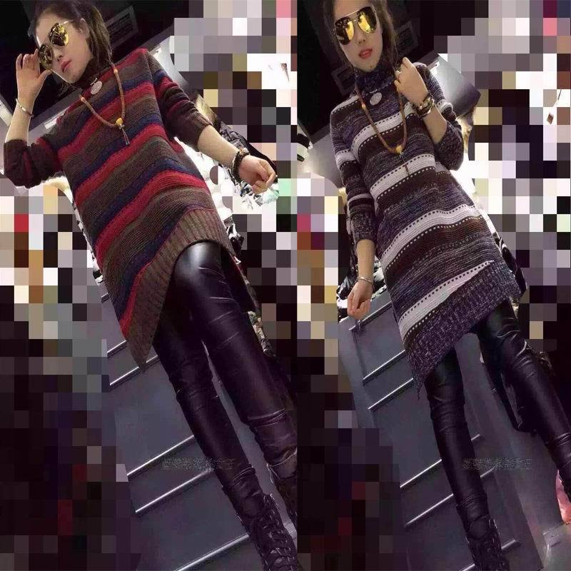 2015歐洲站女裝冬季新款歐貨中長款打底衫高領橫條紋長袖毛衣 /
