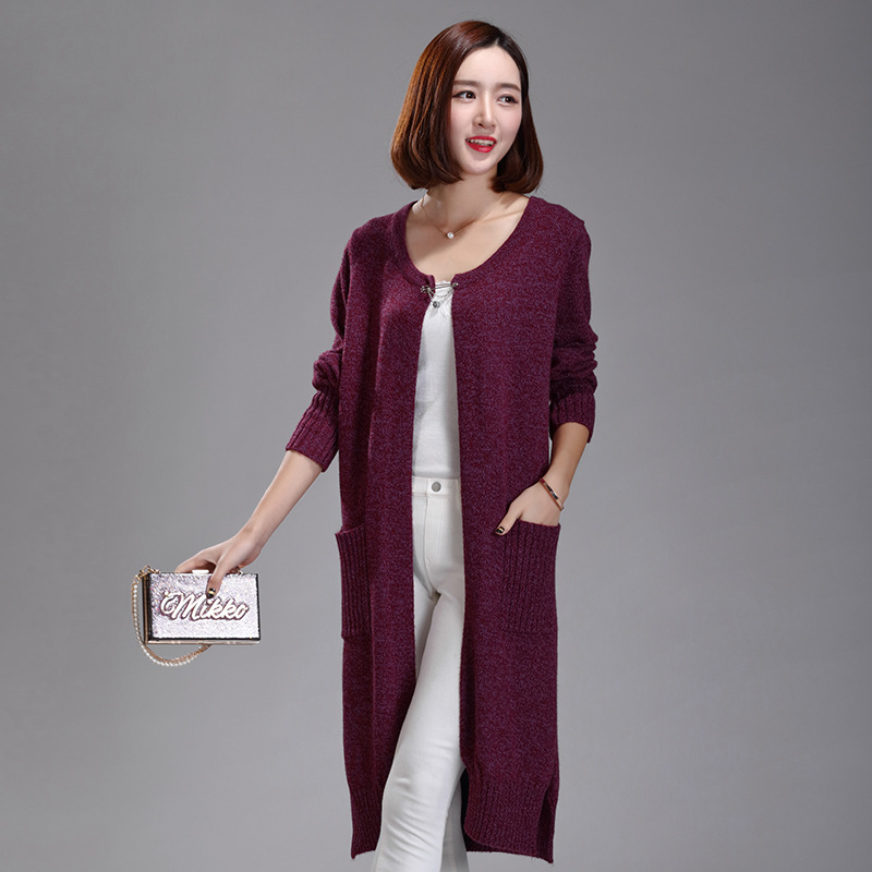 2015秋冬新款女式針織衫 韓版純色圓領口袋中長款百搭毛衣女開衫 /