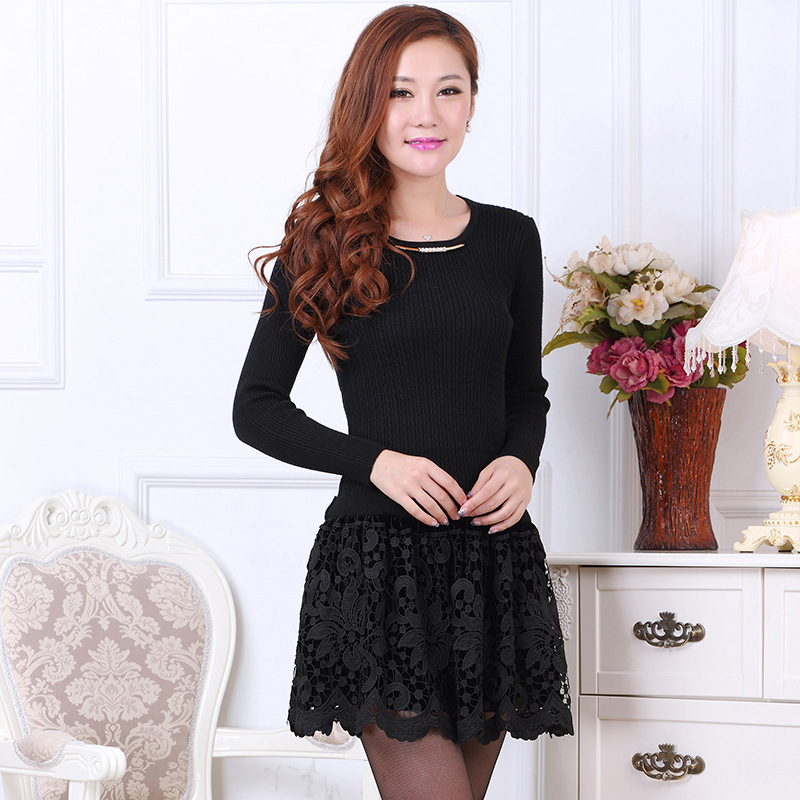 圓領長袖純色女式針織套頭毛衣 拼接下擺蕾絲針織中長款連衣裙 /