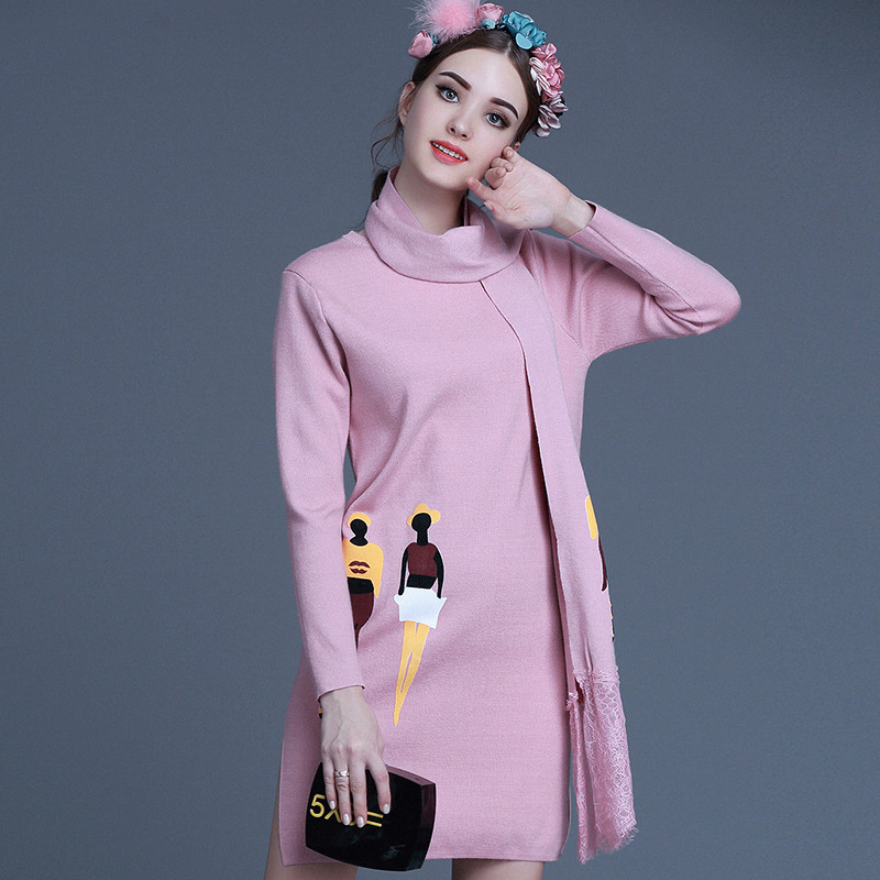 歐美2015冬女裝卡通人物圖案圓領長袖開叉針織連衣裙配圍巾 /