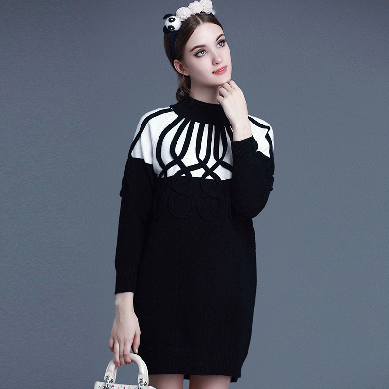 歐美2015冬新款女裝毛衣裙拼色半高領長袖休閑針織連衣裙 /