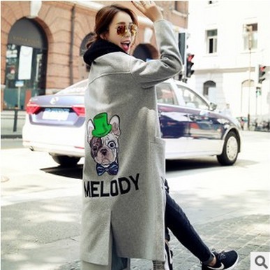 秋冬新款女裝毛呢大衣女韓版中長(zhǎng)款小狗圖案字母刺繡毛呢外套潮 /